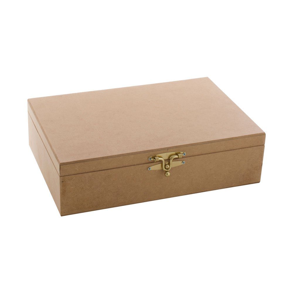 A caixa é equipada com dobradiças e fecho, proporcionando facilidade de abertura e fechamento, além de manter seus pertences seguros. As dobradiças garantem um movimento suave ao abrir e fechar a caixa, enquanto o fecho mantém tudo no lugar, protegendo seus objetos contra poeira e danos externos.