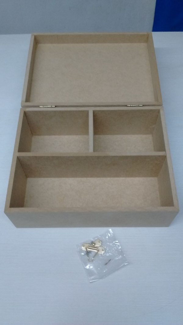 Caixa de MDF madeira cru tipo dobradiça e fecho mini chandon dupla e medida externa de 22cm de comprimento 17cm de largura 9 de altura.