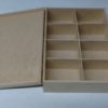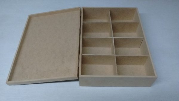 Caixa de MDF cru tipo dobradiça e fecho com 8 DIV e medida externa de 33cm de comprimento 24cm de largura 8 de altura.