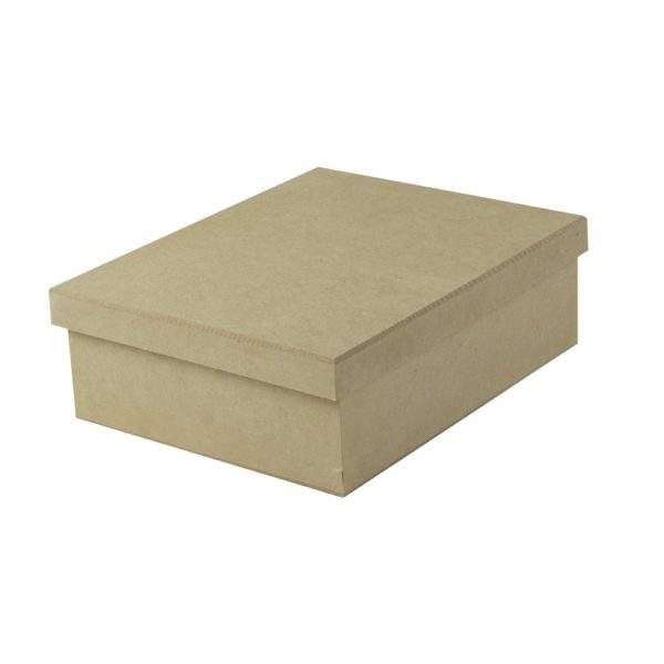 Caixa de MDF cru tipo sapato com medida externa de 25cm de comprimento 20cm de largura 8 de altura.